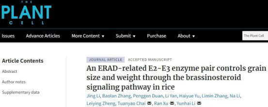 2022年12月15日,Plant Cell在线发表了中国科学院遗传与发育生物学研究所李云海团队完成的题为“An ERAD-related E2-E3 enzyme pair controls grain size and weight through the brassinosteroid signaling pathway in rice“的研究论文,入驻欧乐影院