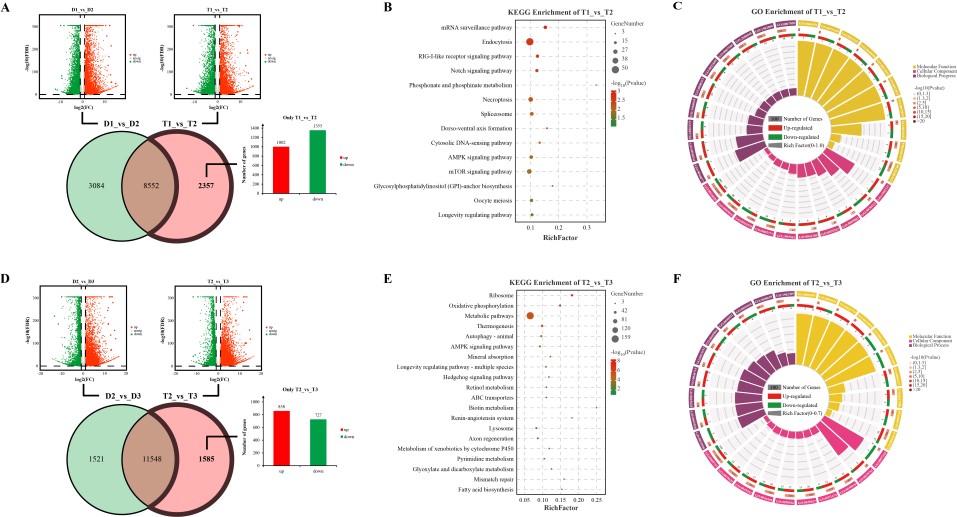 Note: (A)Screening for abnormally expressed genes in pre- and (D) post-embryonic development. (B) KEGG and (C) GO enrichment analysis diagrams for DEGs only in the T1_vs_T2. (E) KEGG and (F) GO enrichment analysis diagrams for DEGs only in the T2_vs_T3.