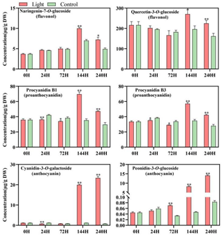 图1. 采后不同光照处理阶段,处理和对照(黑暗)条件下芒果果皮中类黄酮化合物含量的变化