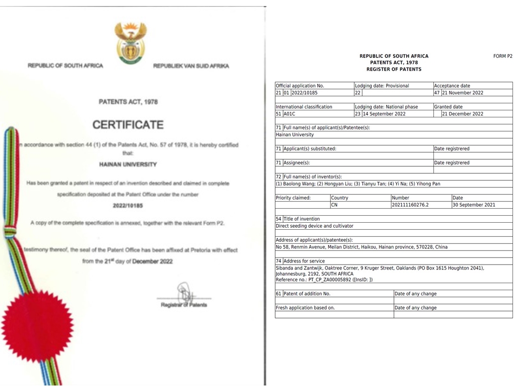 2023年3月热带瓜类作物种质资源创新利用团队收到南非专利局下发的PCT国际发明专利授权证书,该专利主要面向南繁主要作物育种智能化生产,拟实现定量、定向有序种智能化单粒精准播种,解决小区繁育产业瓶颈性问题,对提升南繁育种装备的智能化和精准化水平具有重要的理论和现实意义。