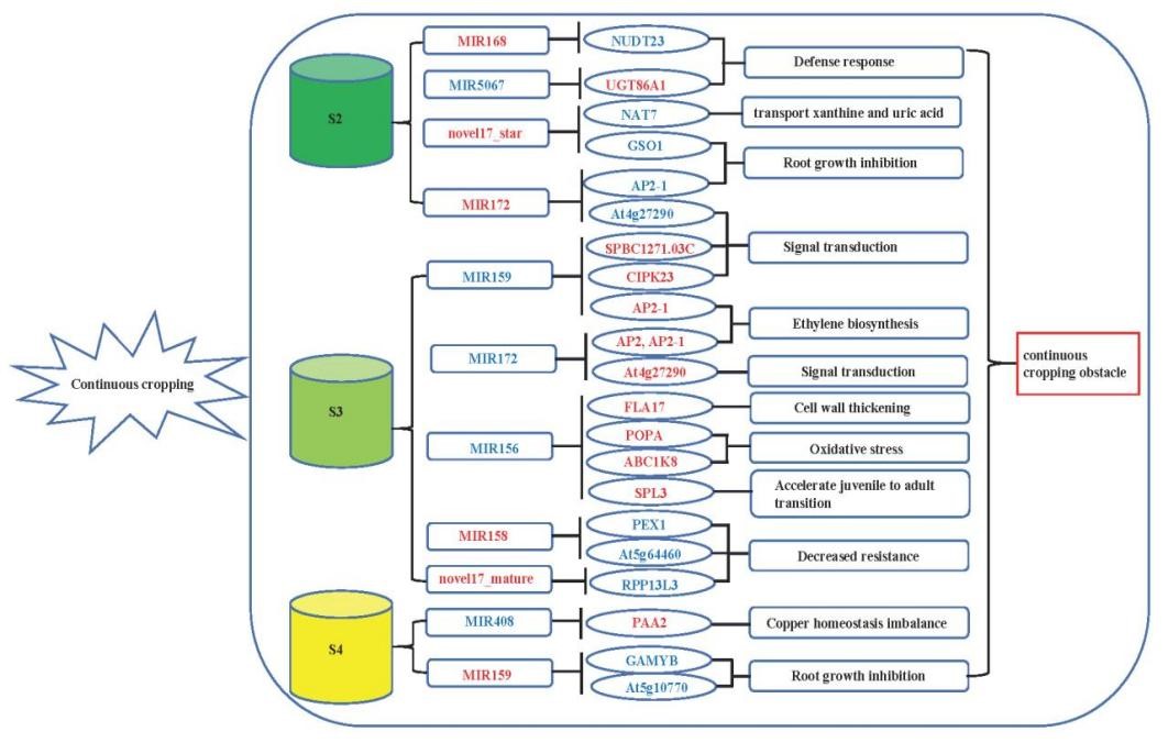 图1. 广藿香响应连作障碍的miRNA和基因调控模式