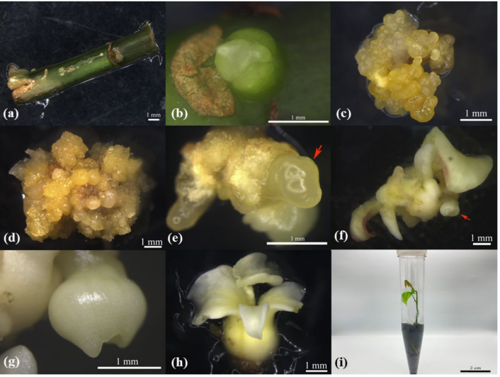 Note:( a ) Mature-period stem segment is 1 cm-long with one bud point; ( b ) ABs with 3 d swelling time; ( c ) callus tissue; ( d ) clumps of embryogenic and non-embryogenic callus; ( e ) globular embryo; ( f ) heart-shaped embryo; ( g ) torpedo embryo; ( h ) mature cotyledon somatic embryo; ( i ) a well-grown regenerated plant. (The arrows (e,f) are shown as the same parts).