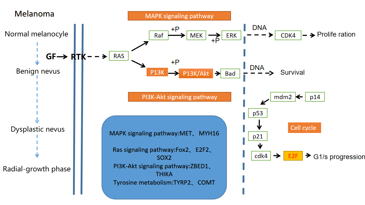 本研究收集了不同来源的360尾豹纹鳃棘鲈个体,(性状分析的技术)并基于全基因组重测序进行了全基因组关联分析(GWAS)。结果筛选出57个与豹纹鳃棘鲈黑色皮肤性状相关的SNPs,在这些SNPs的50 kb范围内总共注释了158个基因。随后,GWAS分别应用于LED、QHH和QHL三个群体,相应的结果与总群体的分析结果进行比对发现,四种GWAS模型的分析结果均显著富集Rap1信号通路、黑色素生成、代谢途径、酪氨酸代谢、cAMP信号通路、AMPK信号通路、PI3K-Akt信号通路、EGFR酪氨酸激酶抑制剂耐药性、HIF-1信号通路、Ras信号通路、MAPK信号通路等(p<0.05),主要关联11个基因(POL4、MET、E2F2、COMT、ZBED1、TYRP2、FOXP2、THIKA、LORF2、MYH16、SOX2 )。在背皮组织中,除COMT以外的10个基因均呈现显著差异(p<0.05),在腹皮组织中除LORF2外其余10个基因全部呈现出显著差异(p<0.05),在尾鳍组织中11个基因均呈现出显著差异(p<0.05)。说明豹纹鳃棘鲈的体色调节过程是多基因多信号通路共同作用的结果。这些结果将有助于深入了解豹纹鳃棘鲈黑色皮肤形成的遗传特征,进而为遗传改良提供理论依据。