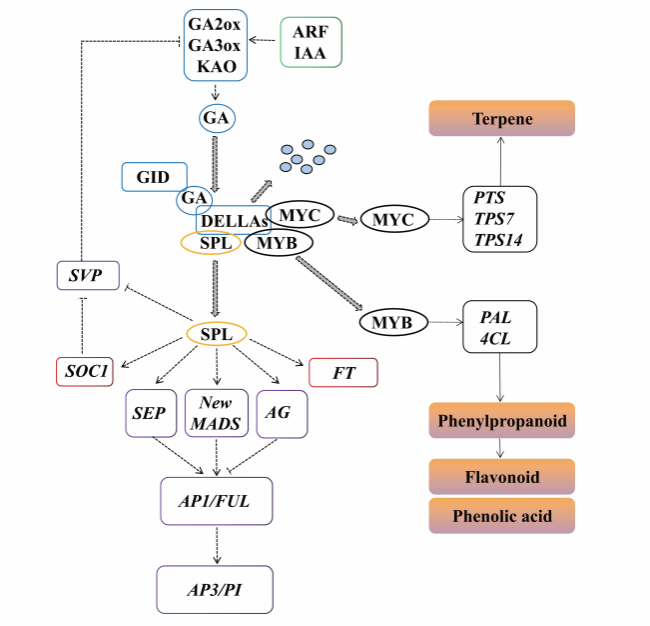 广藿香[Pogostemon cablin (Blanco) Benth.]是一种独特的药用和芳香植物,在世界范围内广泛种植,需求量与日俱增。但由于该物种在中国难以实现开花,其花发育的潜在分子机制和代谢物动态尚不清楚。据此,本团队首次对广藿香花发育过程中的转录组和代谢组进行了比较分析。结果表明,共鉴定到13469个差异表达基因(DEGs)和371个差异积累代谢物(DAMs)。转录组分析表明DEGs与淀粉和蔗糖代谢、萜类生物合成和苯丙烷生物合成相关。在这些DEGs中,有75个MIKC-MADS差异表达基因与花器官发育相关。赤霉酸、生长素和衰老信号可能形成一个交叉调控网络来调控广藿香花的发育。根据代谢轮廓,主要的DAMs为氨基酸、类黄酮、萜类、酚类及其衍生物。这些优势DAMs的积累模式与花的发育阶段密切相关。DEGs和DAMs的整合分析表明,由于淀粉和蔗糖代谢的激活,苯丙素、类黄酮和氨基酸类化合物可能发生积累。我们的研究结果在分子水平上为阐明广藿香花的生殖过程、花器官和花色形成提供了一些重要的见解。这些结果将增进我们对广藿香花发育相关的分子和遗传机制的理解。