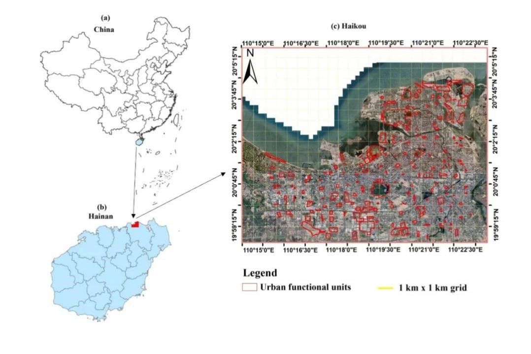 图1. 海口的地理位置;(a)中国和海南的方位图,(b)海南和海口市,(c)海口市卫星地图(//www.google.com/maps)显示本研究调查城市功能单元(UFUs,红色边界)