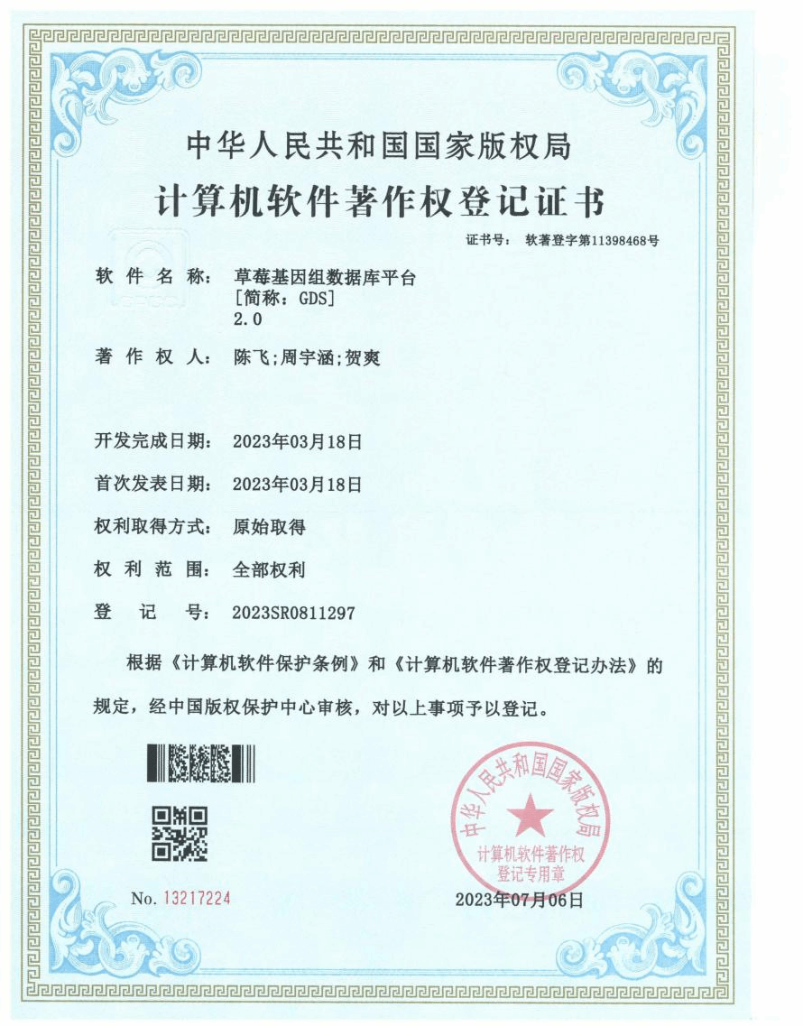 陈飞教授团队在前期研究中,破译了首个草莓的完整基因组,积累了丰富的草莓多组学数据和多组学分析技术,基于此,该团队开发了草莓组学数据库一项,收录了十一个草莓基因组数据,搭建了首个草莓基因组分析平台,可用于草莓遗传在线分析和海量数据分析和可视化。改数据库是首个草莓为主题的基础数据库,获得了全世界五十多个国家和地区的访问,促进了团队的知名度和影响力。基因组分析和数据库主要完成人为周宇涵硕士生,于2023年7月,获批软著一项。