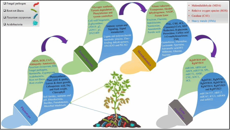 图10. 连作障碍中不同药用植物的生理、转录组、代谢组和基因调控网络概述