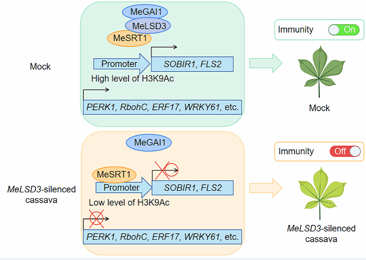 该团队在Plant Physiology上在线发表了题为“LESION SIMULATING DISEASE 3 regulates disease resistance via fine-tuning histone acetylation in cassava”的研究论文,揭示了Gibberellic acid insensitive 1(MeGAI1)-MeLSD3-Sirtuin 1(MeSRT1)互作分子模块通过乙酰化修饰调控木薯抗病基因的表达和抗病反应的分子机制。研究结果不仅为乙酰化修饰介导的木薯抗病性反应提供了新见解,而且为木薯分子遗传改良提供了抗病基因模块网络。