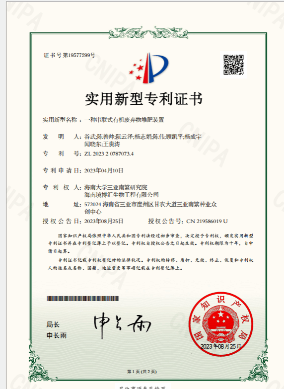 8月25日,热带耕地养分循环利用与质量保育团队获得1项实用新型专利“一种串联式有机废弃物堆肥装置”授权。