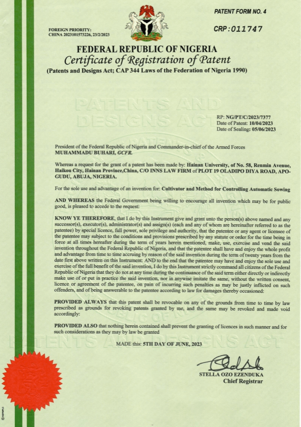 图14. “一种小区繁育播种机”国际发明专利授权证书
