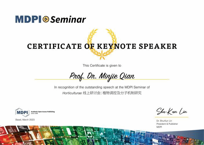 近日,热带水果品质发育调控科技创新团队钱敏杰副教授作为Keynote speaker在MDPI出版机构和Horticulturae期刊组织的线上研讨会“植物调控及分子机制研究”做了题为“光调控园艺作物品质的生理及分子机制”的报告,介绍了光照在黄瓜、辣椒、芒果等园艺作物上调控植株矮化、果实着色、类黄酮合成等方面起作用,从而为生产上园艺作物品质的改善提供技术支持。