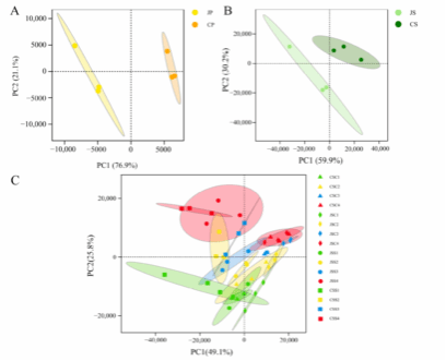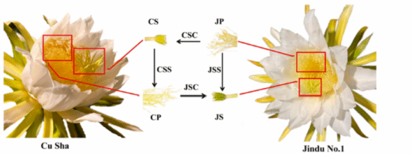 图2. Sample collection plots of Cu Sha (self-incompatible) and Jindu No. 1 (self-compatible) with CS and JS as unpollinated, CP and JP as pollen, CSS and JSS as self-pollinated, and CSC and JSC as cross-pollinated stigmas.