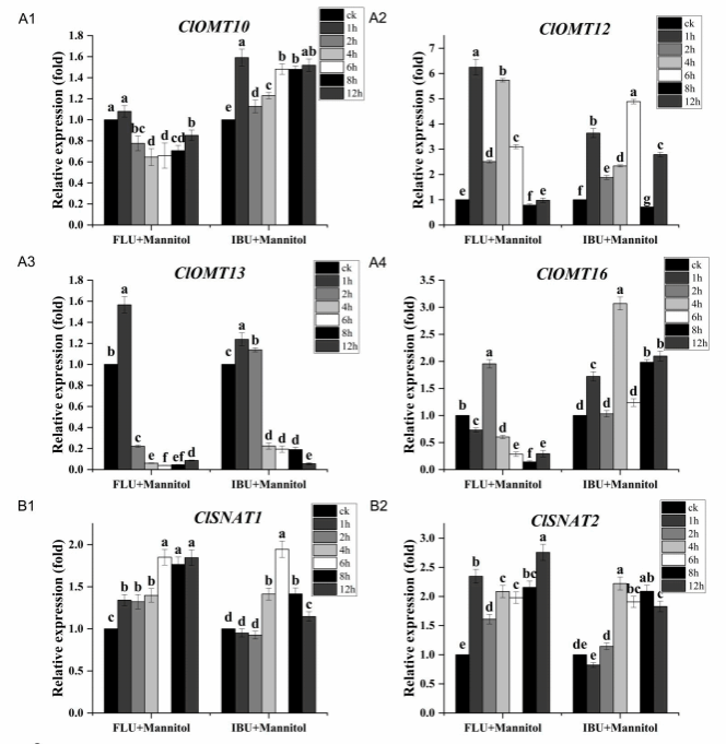 Note: (A: A1–A4) The expression patterns of ClOMTs; (B: B1, B2) The relative expression of ClSNATs;