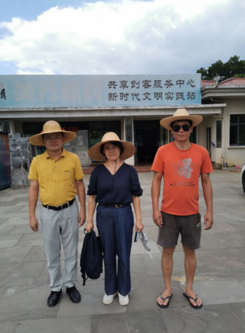 图31. 海胶集团研究人员(左一)、陈健妙副教授(中间)和海南经济特区强富美农业科技开发有限公司研究人员(右一)共同研讨魔芋种植提质增效