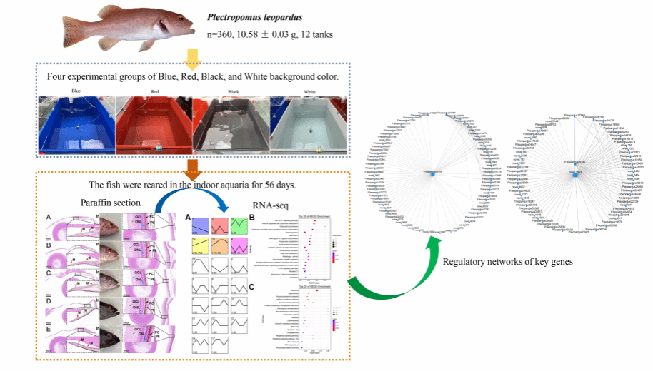 豹纹鳃棘鲈是一种名贵的海水养殖鱼类,其皮肤颜色受背景颜色的影响很大。然而,视觉对豹纹鳃棘鲈皮肤颜色变化的影响尚不清楚。本研究采用转录组分析的方法研究了不同背景颜色下的视觉反应机制。眼石蜡切片显示,背景色使虹膜色素细胞(PCs)和外核层(ONL)发生形态学改变,虹膜颜色变暗。转录组分析结果表明,不同背景颜色下养殖的豹纹鳃棘鲈眼睛中基因表达有显著差异。团队分别在白色组与初始组、蓝色组与初始组、红色组与初始组、黑色组与初始组的两两比较中鉴定出4845、3069、5874和6309个差异表达基因。确定了调控豹纹鳃棘鲈眼睛对背景色适应机制的一些枢纽基因和关键通路,即JAK-STAT、mTOR、Ras信号通路,以及ndufb7、slc6a13、novel3553等基因。豹纹鳃棘鲈对养殖背景色的适应是通过中枢基因和关键途径介导的应激蛋白合成和能量平衡供应实现的。此外,苯丙氨酸代谢、酪氨酸代谢和肌动蛋白细胞骨架相关的过程或途径和基因负责虹膜和皮肤颜色对养殖背景色的适应。