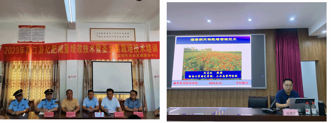 三亚南繁院辣椒生物学团队成善汉教授分别于2023年6月15日、8月10日在昌江欧兰德毛豆南繁产业园、十月田镇姜园村面向基层农技人员、姜园村圣女果种植户开展了辣椒、圣女果关键种植技术培训,从辣椒产业趋势、种类与品种选取、水肥管理与主要病虫害防控,圣女果嫁接苗判别方法、果实增甜措施、降低裂果问题、增强病毒病抗性等方面分享了技术经验,并对新《种子法》与与会人员进行了解读,136人次人员参与了培训。
