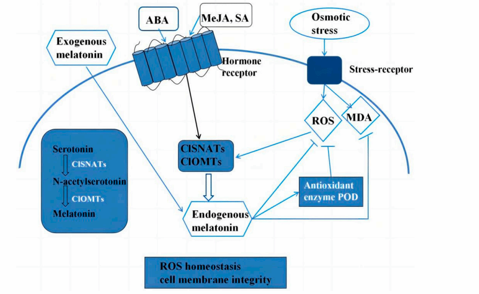 图9. A hypothetical model for the regulation of melatonin biosynthesis against osmotic stress.