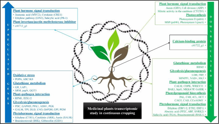 图11. 不同药用植物在连作障碍下的转录组研究 注:蓝色显示上调基因,绿色显示下调基因。