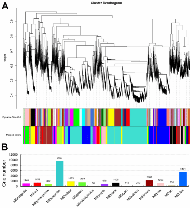Note: A: Hierarchical cluster tree; each leaf represents a gene, and each branch represents a module. They are labeled with different colors. B: The gene numbers in each module.