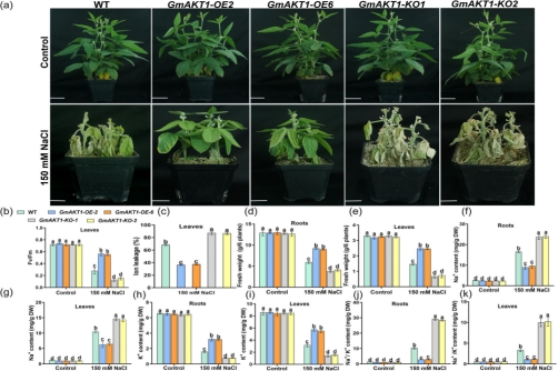 研究人员首先对GmAKT1的过表达和敲除大豆进行盐胁迫处理,发现盐胁迫下过表达GmAKT1株系的Fv/Fm以及根和叶片中的干鲜重显著高于野生型,而在敲除GmAKT1株系则显著低于野生型 (图1b-f)。进一步研究表明,盐胁迫下过表达GmAKT1根和叶片中的Na+含量以及Na+/K+比值显著低于野生型,K+含量显著高于野生型,而敲除GmAKT1株系则与之相反。通过以上研究表明GmAKT1基因可通过调节K+吸收,进而维持Na+/K+平衡,最终增强大豆耐盐性(图 1g-k)。