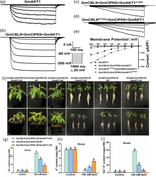 为了进一步明确GmAKT1介导K+吸收是否受到Ca2+-GmCBL9-GmCIPK6复合体的调控,研究者利用全细胞膜片钳检测不同转染细胞中K+向细胞内整流的情况。首先,将钙离子感受器GmCBL9中与Ca2+结合的位点进行突变,发现转GmCBL9E172Q、GmCIPK6和GmAKT1的HEK293T细胞中,K+向细胞内整流趋势显著降低(图 4d-e),表明GmAKT1介导K+吸收依赖于Ca2+信号网络的调控。进一步研究发现,与单转GmAKT1的细胞相比较,共转GmCBL9、GmCIPK6和GmAKT1细胞中K+向细胞内整流趋势显著增加,表明Ca2+-GmCBL9-GmCIPK6复合体促进GmAKT1对K+吸收(图4a-b)。此外,为了验证GmAKT1介导K+吸收是否依赖于上游GmCBL9-GmCIPK6的磷酸化调控,研究者将GmAKT1的磷酸化位点进行突变,然后对转GmCBL9、GmCIPK6和GmAKT1S730A的细胞进行电流检测,发现GmAKT1的磷酸化位点突变后,K+向细胞内整流趋势显著降低(图4c)。通过以上研究结果,表明了GmAKT1介导K+吸收依赖于Ca2+-GmCBL9-GmCIPK6复合体的磷酸化修饰作用。另外,研究者以过表达/敲除GmAKT1以及野生型大豆为背景材料,利用大豆发状根体系分别过表达GmCBL9、GmCIPK6以及GmCBL9+GmCIPK6基因至上述大豆材料中,并通过分析盐胁迫下不同转基因大豆发状根的表型、Na+、K+含量以及Na+/K+比值的变化关系(图 4f-i),揭示了GmCBL9-GmCIPK6复合体通过磷酸化并激活GmAKT1对K+吸收,以维持体内Na+/K+平衡,最终提高大豆耐盐性。
