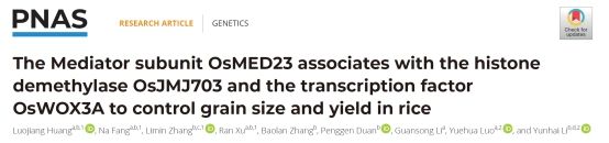为第一完成单位在《美国国家科学院院刊》(PNAS)发表题为“The Mediator subunit OsMED23 associates with the histone demethylase OsJMJ703 and the transcription factor OsWOX3A to control grain size and yield in rice”的研究论文,揭示了转录抑制复合体OsJMJ703-OsMED23-OsWOX3A调控水稻种子大小与产量的新机制。