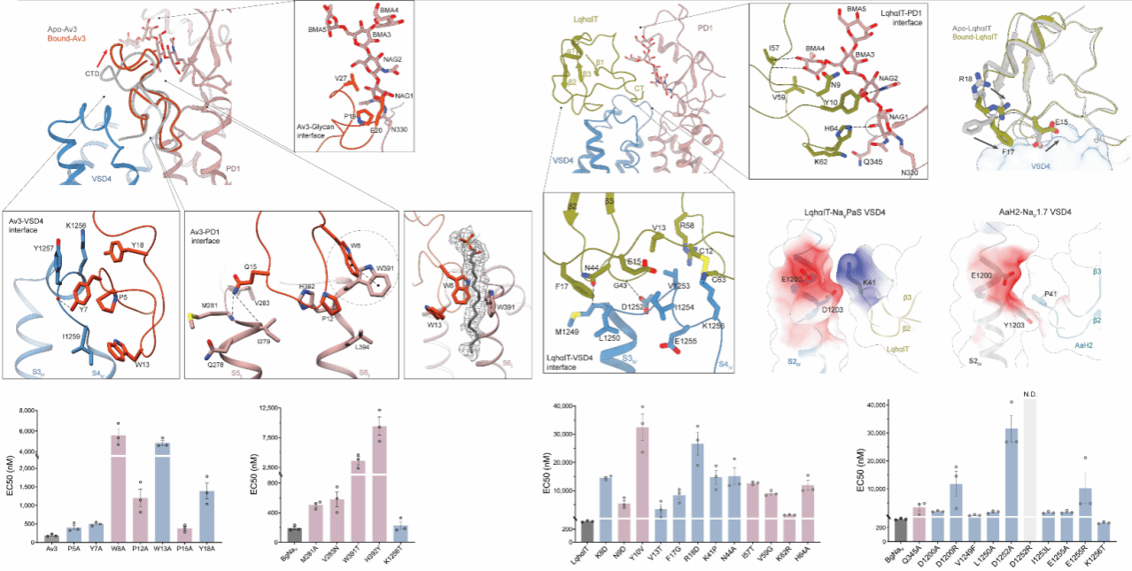 进一步结合突变扫描、表面等离子共振及电生理功能分析发现,多肽与钠通道界面的一系列关键残基共同决定了其对昆虫通道的高选择性识别能力。这些关键界面残基能够精准识别昆虫Nav通道特有的结构特征,使多肽对昆虫通道具有较高亲和力,而对哺乳动物通道影响较弱,从而形成显著的物种选择性,例如Av3毒素的Trp8和Pro12,将此处氨基酸残基代替为丙氨酸Ala后显着降低了Av3的结合亲和力和功效;LqhαIT毒素的Asn44和His64对于结合至关重要,将此处氨基酸残基代替为Ala后显着降低LqhαIT活性47.1倍和37.1倍。本研究通过多方面验证,首次系统阐明了动物源杀虫多肽实现昆虫选择性的分子机制。