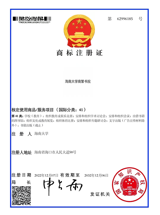 2022年12月29日,"欧乐影院 三亚南繁书院"商标获国家知识产权局批准注册。该商标注册有效期自2022年12月7日起至2032年12月6日,服务于欧乐影院 的书院制建设、教育培训、文创产品创制、学术研讨会的开展、举办文体比赛、文化展览、书籍出版等项目,为更好的建设欧乐影院 提供平台。