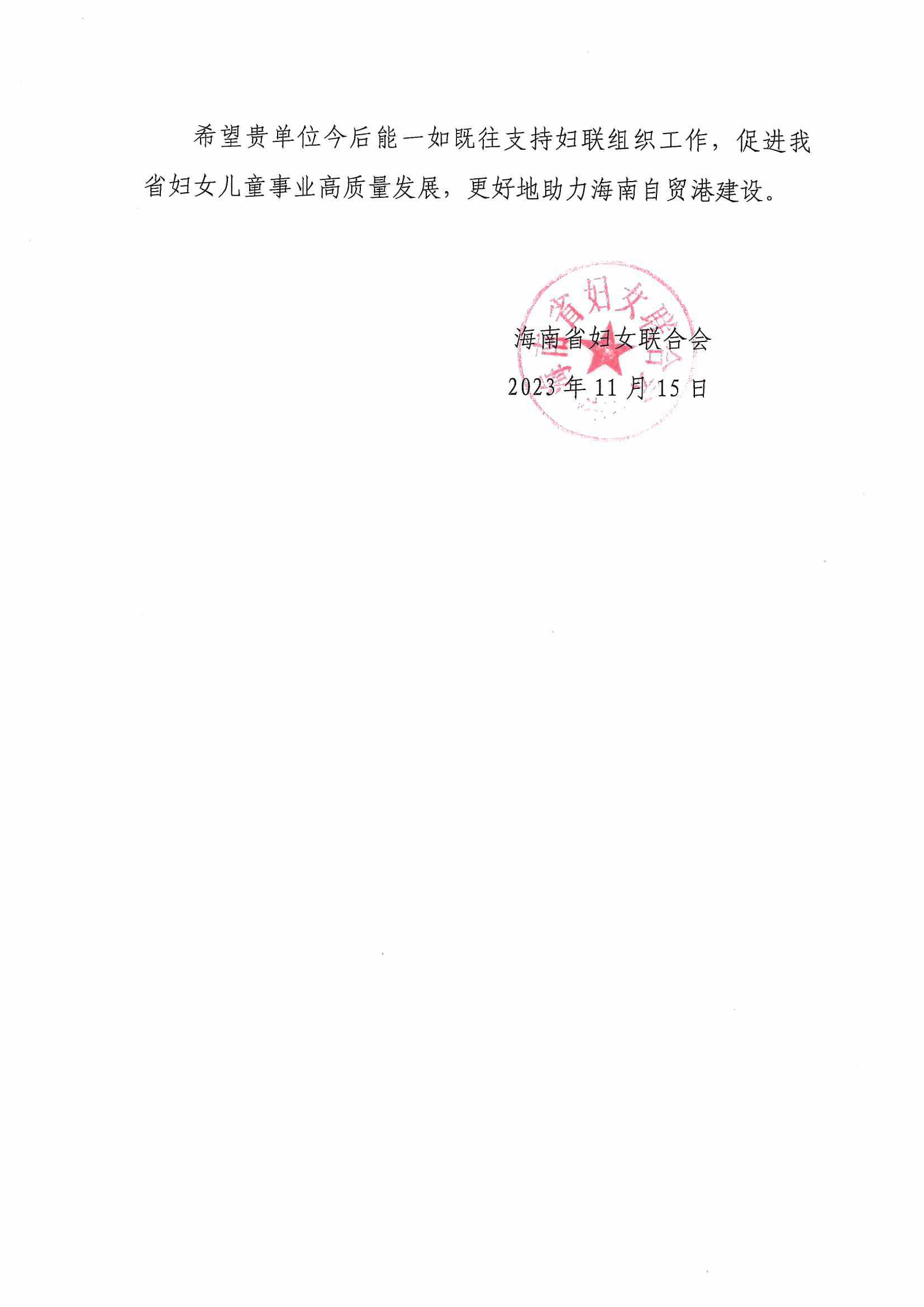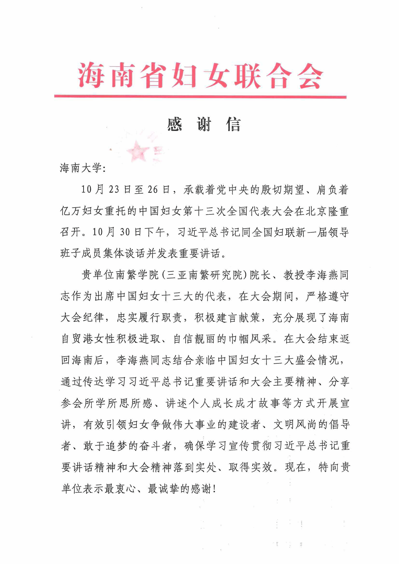 海南省妇女联合会感谢信