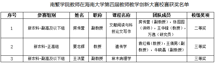 教师教学创新大赛校赛在海甸校区顺利落下帷幕,经个人申报、学院选拔推荐、学校专家组二轮评审多个环节的经过激烈角逐,房传营老师的《文献阅读与科技论文写作》团队荣获新农科-副高及以下组二等奖、夏志辉老师的《遗传学》团队荣获新农科-正高组三等奖、王洪星老师的《林木病理学》团队荣获新农科-副高及以下组三等奖。