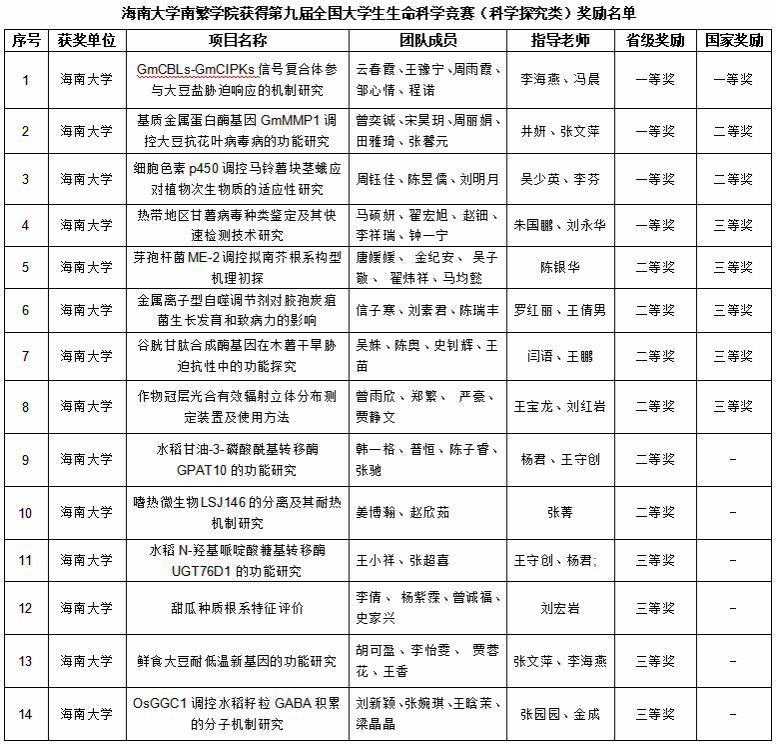 师生用实际行动诠释了以赛促教、以赛促学、求真务实、敢于挑战的内涵,助力创新型人才培养体系建立和人才培养质量的提升。学院师生将始终对科学心怀敬畏,在理论与实际结合的基础上探究新的方法和技术,坚持探索真理,为推动学校新农科建设高质量发展作出贡献,助力综合性研究型国际化“双一流”大学建设,期待更多的南繁学子在学科竞赛的舞台上再创佳绩!