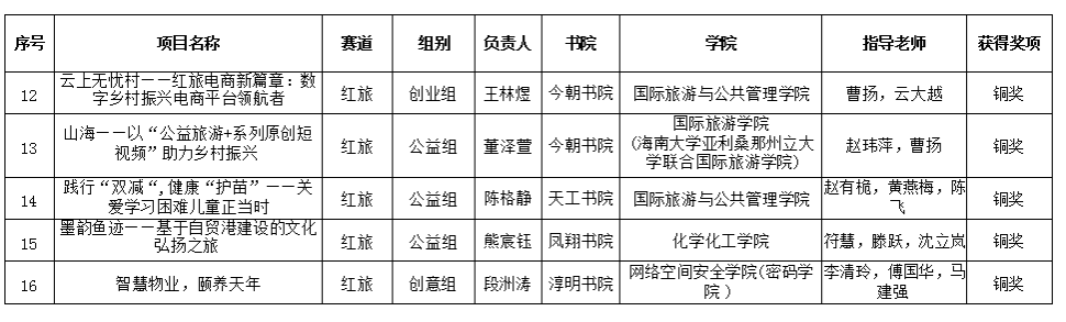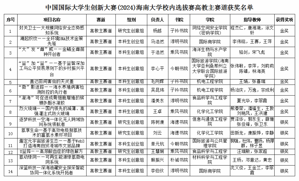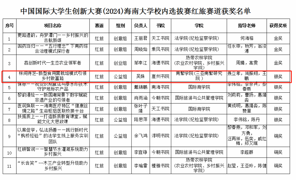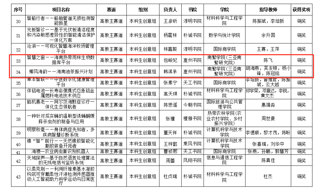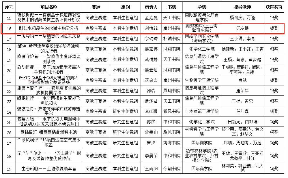 师生的参赛作品在学校众多队伍中脱颖而出,吴友根老师指导的“耐盐水稻品种的代谢生物学分析”荣获高教主赛道银奖;陈飞老师指导的“智慧之窗——海南热带雨林生物数据库平台”荣获高教主赛道铜奖;胡海燕老师、吴友根老师、杨小锋老师指导的“椰风海韵——海南油茶振兴计划”荣获高教主赛道铜奖;聂立孝老师、周振翔老师、王鹏老师指导的“林间得芝-新型食用菌栽培模式引领乡村致富路”荣获红旅赛道银奖。