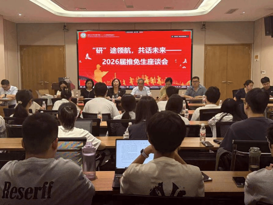 在众创中心701会议室召开2026届推免生座谈会。学院党委书记黄东益、院长李海燕、本科教学副院长陈艳丽、责任教授聂立孝与罗红丽及2022级班级导师出席会议,研究生教学副院长徐冉主持会议。