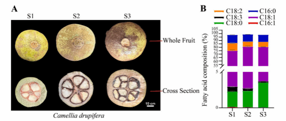 图1.油茶(C.drupifera)种子在不同发育阶段的脂肪酸组成观察与测定。(A)油茶的三个发育阶段。(B)发育中种子的脂肪酸组成。C16:0为棕榈酸;C16:1为棕榈油酸;C18:0为硬脂酸;C18:1为油酸;C18:2为亚油酸;C18:3为亚麻酸。