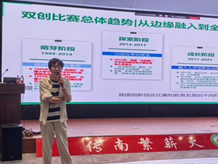 特邀华南农业大学崔紫宁教授作“以赛促学——双创竞赛育人路径与实践探索”专题报告。现场座无虚席,三百余名师生共同参与,学术氛围热烈,报告会由陈艳丽副院长主持。